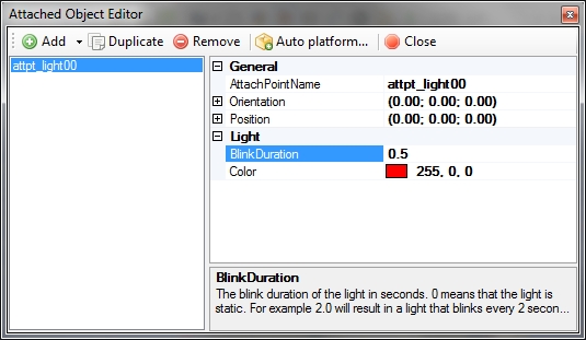 In the attached object editor of ModelConverterX you can add lights to your object. On export to FSX these lights will be converted into effect (FX) files. Besides the colour you can now also specify a blink duration for those lights. This means you can create flashing lights.